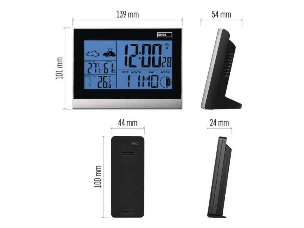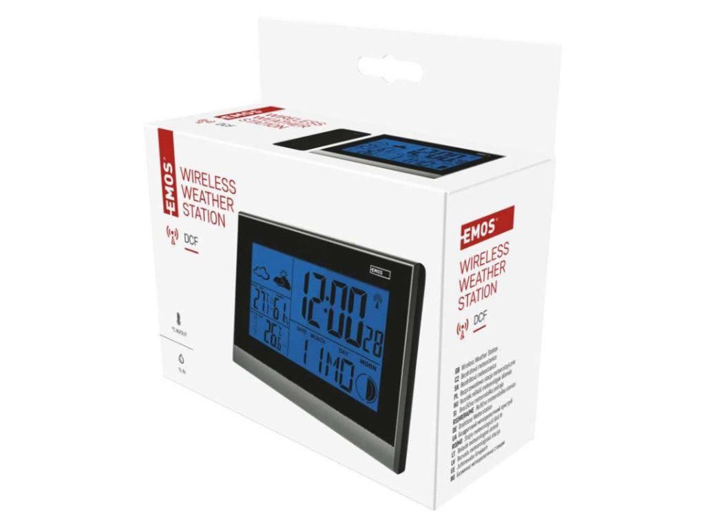 12/24 formát času: ano|anemometr: ne|barevný displej (black mask) podsvícený: ne|barometr: ne|budík: ano|časová pásma: ano|další funkce: –|datum: ano|dosah čidla: až 30 m|drátová sonda k čidlu: ne|elektronické plošné podsvícení: ne|fáze měsíce: ano|hodiny: řízené DCF signálem|kalendář: ano|kompatibilita: –|korekce nadmořské výšky: ne|LED podsvícení displeje: ano|min. a max. teplota: ne|možné další čidlo: až 3 čidla (E03070)|možnost nastavení jednotky teploty: °C/°F|možnost pověšení na zeď: ne|napájení čidla: 2× 1,5 V AAA (nejsou součástí balení)|napájení stanice: 3× 1,5 V AAA (nejsou součástí balení)|notifikace do mobilní aplikace: –|opakované buzení: ano|ovládání hlasovými asistenty: –|podporované OS: –|předpověď počasí: ano|přenosová frekvence: 433 MHz|prodejní obal: 1 ks, krabička|produkt: meteostanice|projekce: ne|protokol: –|provedení: bezdrátové|rozměr čidla: 24 × 44 × 100 mm|rozměr hlavní jednotky: 54 × 139 × 101 mm|síťový adaptér: ne|srážkoměr: ne|teplotní výstraha: ne|trend teploty: ano|trend tlaku: ne|trvalé podsvícení: ne|velikost displeje: 111 × 61 mm|venkovní teplota: -30 °C až +60 °C, rozlišení 0,1 °C|venkovní vlhkost: ne|vnitřní teplota: 0 °C až +50 °C, rozlišení 0,1 °C|vnitřní vlhkost: 20 % až 90 % RV, rozlišení 1 %Doplňkové parametry