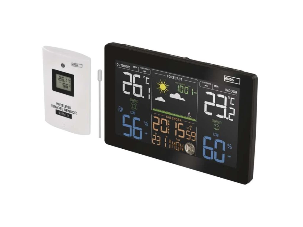 12/24 formát času: ano|anemometr: ne|barevný displej (black mask) podsvícený: ano|barometr: ano|budík: ano, 2×|časová pásma: ano|datum: ano|dosah čidla: až 50 m|drátová sonda k čidlu: 0,95 m|elektronické plošné podsvícení: ano|fáze měsíce: ano|hodiny: řízené DCF signálem|kalendář: ano|korekce nadmořské výšky: ne|LED podsvícení displeje: ano|min. a max. teplota: ano|možné další čidlo: až 3 čidla (E05018)|možnost nastavení jednotky teploty: °C/°F|možnost pověšení na zeď: ano|napájení čidla: 2× 1,5 V AAA (nejsou součástí balení)|napájení stanice: 3× 1,5 V AAA (nejsou součástí balení)|opakované buzení: ano|předpověď počasí: ano|přenosová frekvence: 433 MHz|prodejní obal: 1 ks, krabička|produkt: meteostanice|projekce: ne|provedení: bezdrátové|rozměr čidla: 21 × 60 × 100 mm|rozměr hlavní jednotky: 26 × 197 × 125 mm|síťový adaptér: ano, 5 V DC/600 mA (součástí balení)|srážkoměr: ne|teplotní výstraha: ne|trend teploty: ano|trend tlaku: ano|trvalé podsvícení: ano|velikost displeje: 164 × 90 mm|venkovní teplota: -40 °C až +70 °C, rozlišení 0,1 °C|venkovní vlhkost: 20 % až 95 % RV, rozlišení 1 %|vnitřní teplota: -10 °C až +50 °C, rozlišení 0,1 °C|vnitřní vlhkost: 1 % až 99 % RV, rozlišení 1 %Doplňkové parametry